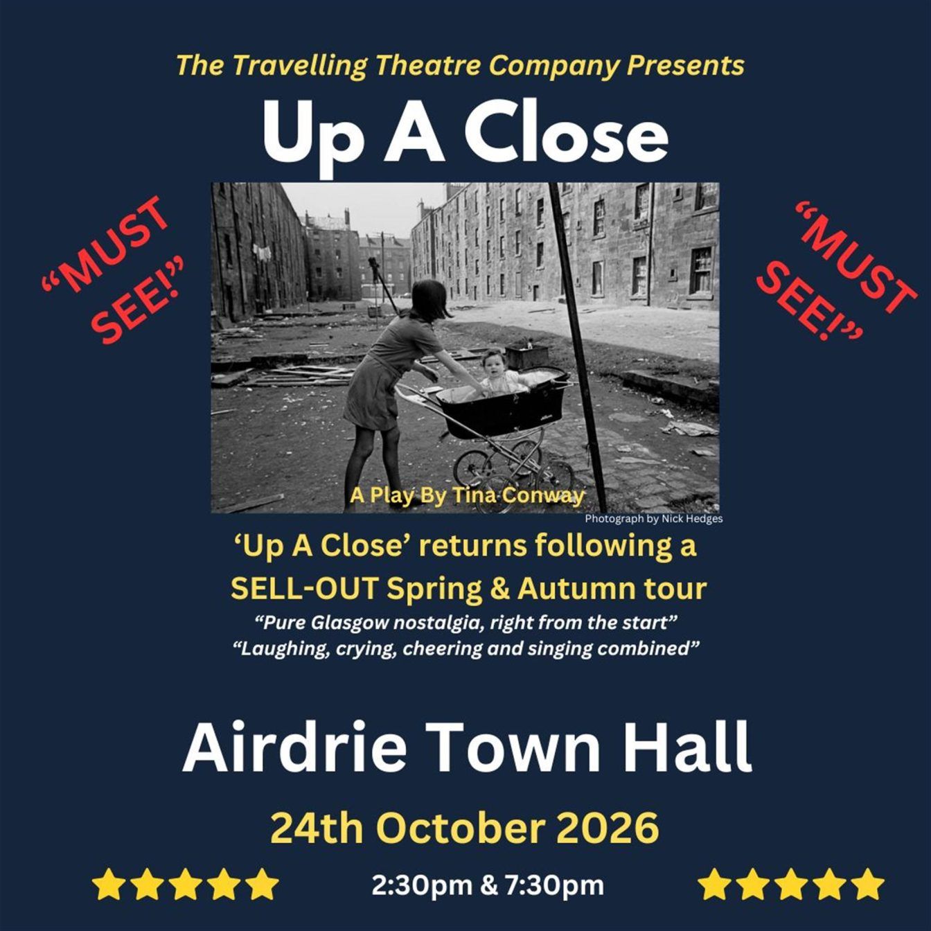 Following multiple SELL OUT runs in 2023 and 2024 and 2025 and two SELL OUT performances at Glasgow’s iconic Pavilion Theatre, UP A CLOSE is coming to the fabulous Town Hall Theatre, Airdrie